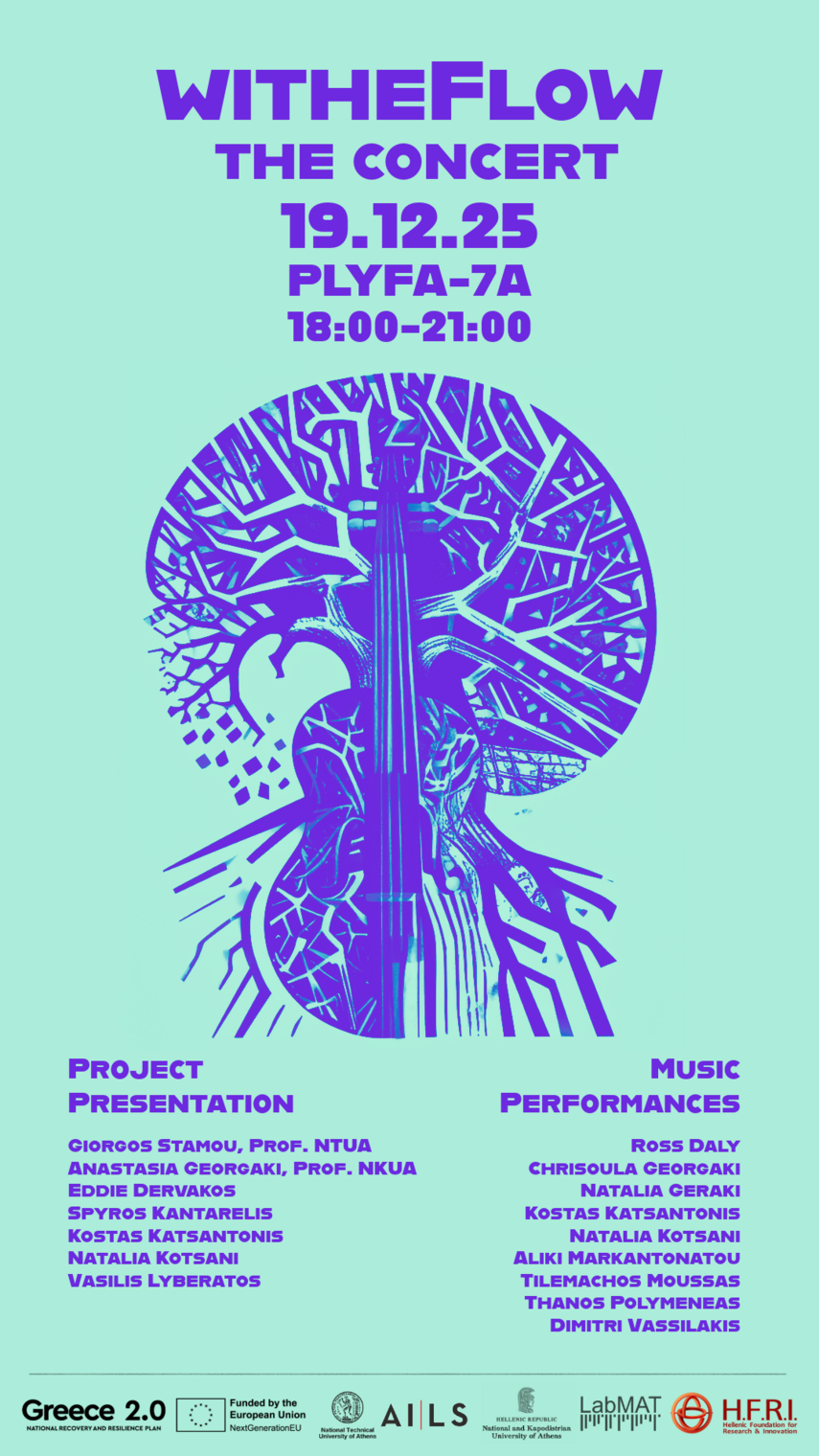 Το ερευνητικό έργο witheFlow, αφιερωμένο στη δημιουργία ενός καινοτόμου συστήματος που στοχεύει στην ενίσχυση της εκφραστικότητας του μουσικού αξιοποιώντας εργαλεία Τεχνητης Νοημοσύνης και σήματα από βιοαισθητήρες (εγκεφαλικά κύματα, καρδιακός παλμός κ.ά.), ολοκληρώνεται τον Δεκέμβριο του 2025 και παρουσιάζονται τα αποτελέσματά του σε μια ανοιχτή εκδήλωση–συναυλία.